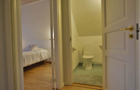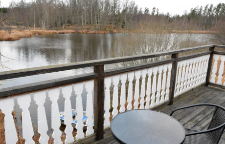 En trappa upp finns 2 stycken bekväma sovrum med bra sängar. Det ena sovrummet har dörrar ut mot en balkong och där ute har ni panoramautsikt ut över Mörrumsån och naturen. Här uppe finns dessutom en extra wc.